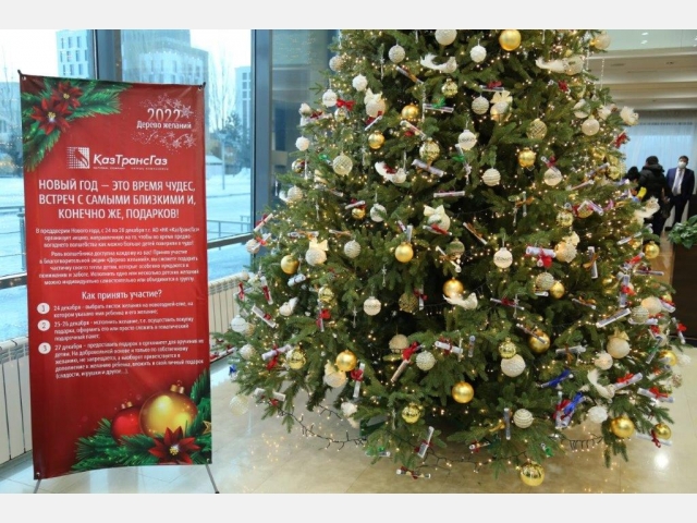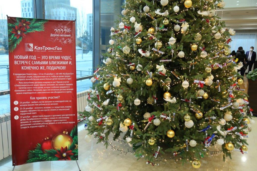 В преддверии наступающего 2022 года Национальная компания «КазТрансГаз» провела благотворительную акцию «Дерево желаний». В рамках данного проекта 270 детей из многодетных, малообеспеченных семей, а также воспитанники Центра социального обслуживания "Нұрлы жүрек" и специальной школы-интернат №1 получили подарки, о которых просили в письмах Деду Морозу.